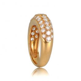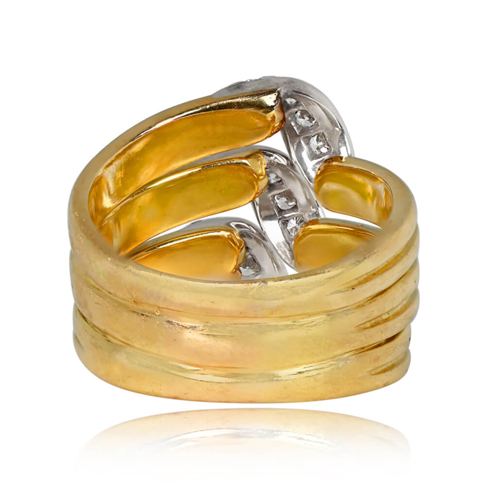 An asymmetrical vintage Cartier triple ring handcrafted in 18k yellow gold. A rolled section on the front of each ring is pave-set with round brilliant cut diamonds. The diamonds are collection grade (D-F color, VVS1-VS1 clarity) and weigh approximately 0.51 carats. This ring was handcrafted in Italy circa 1970.