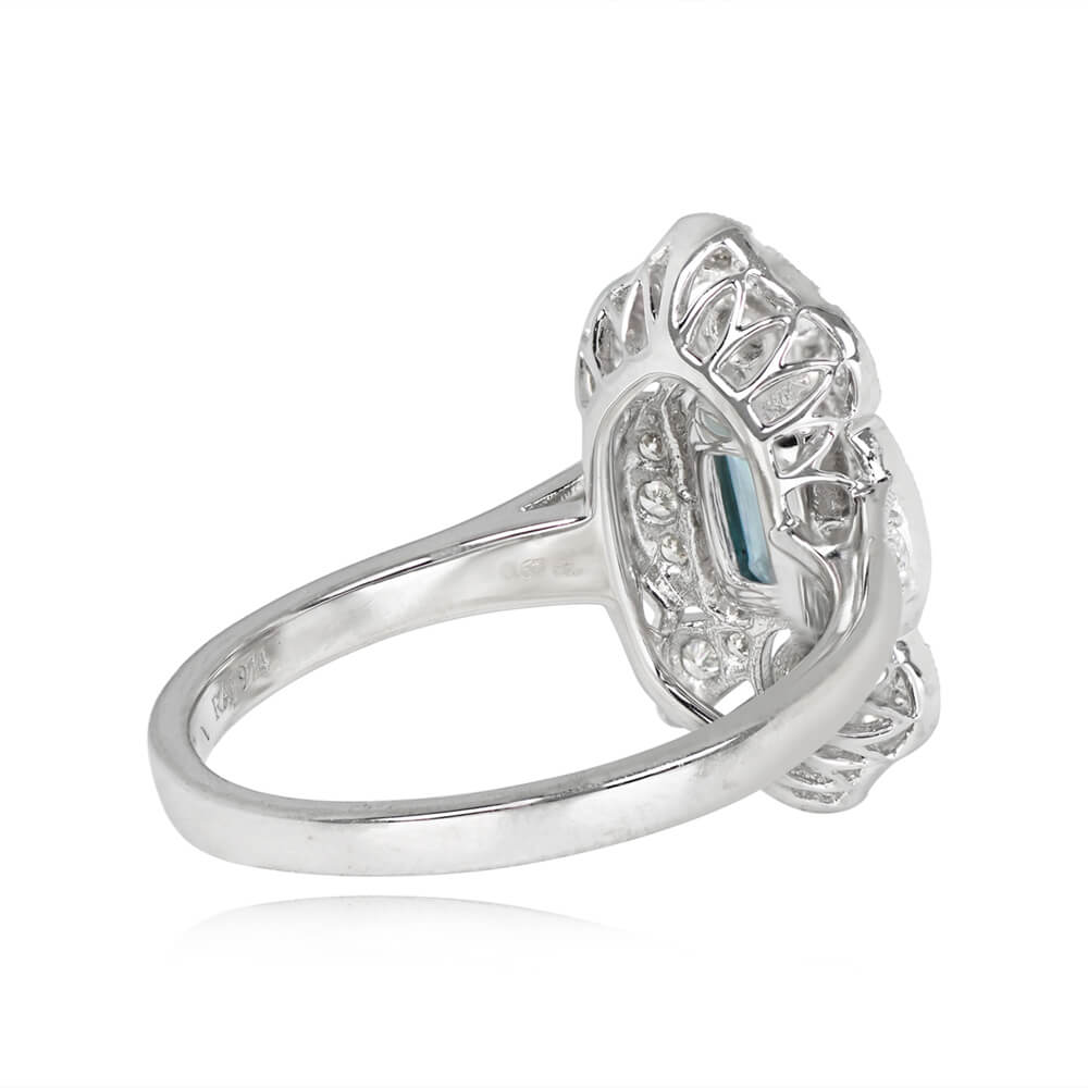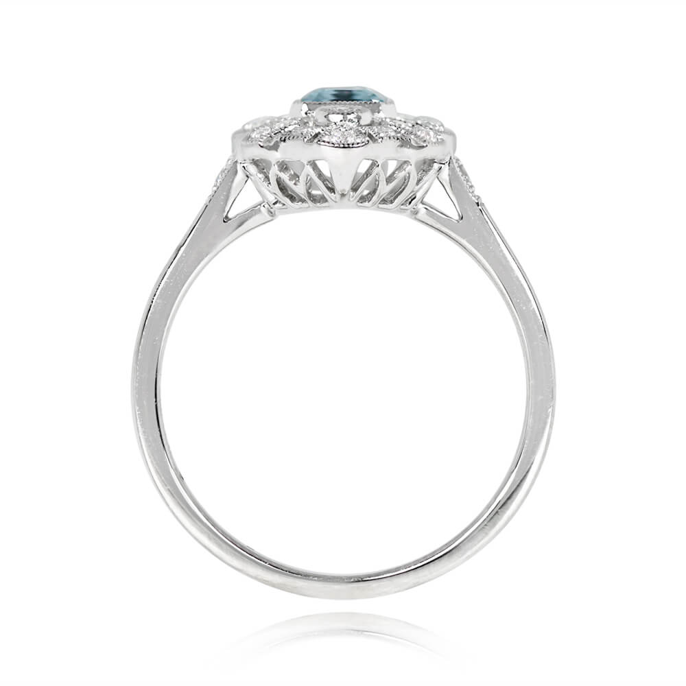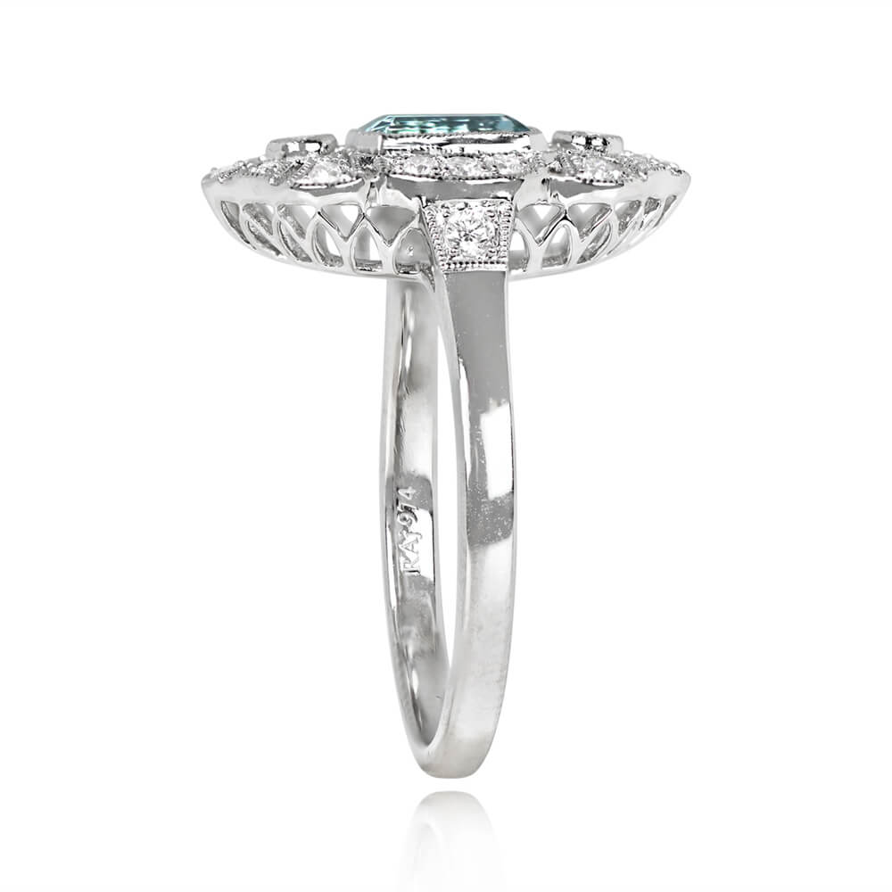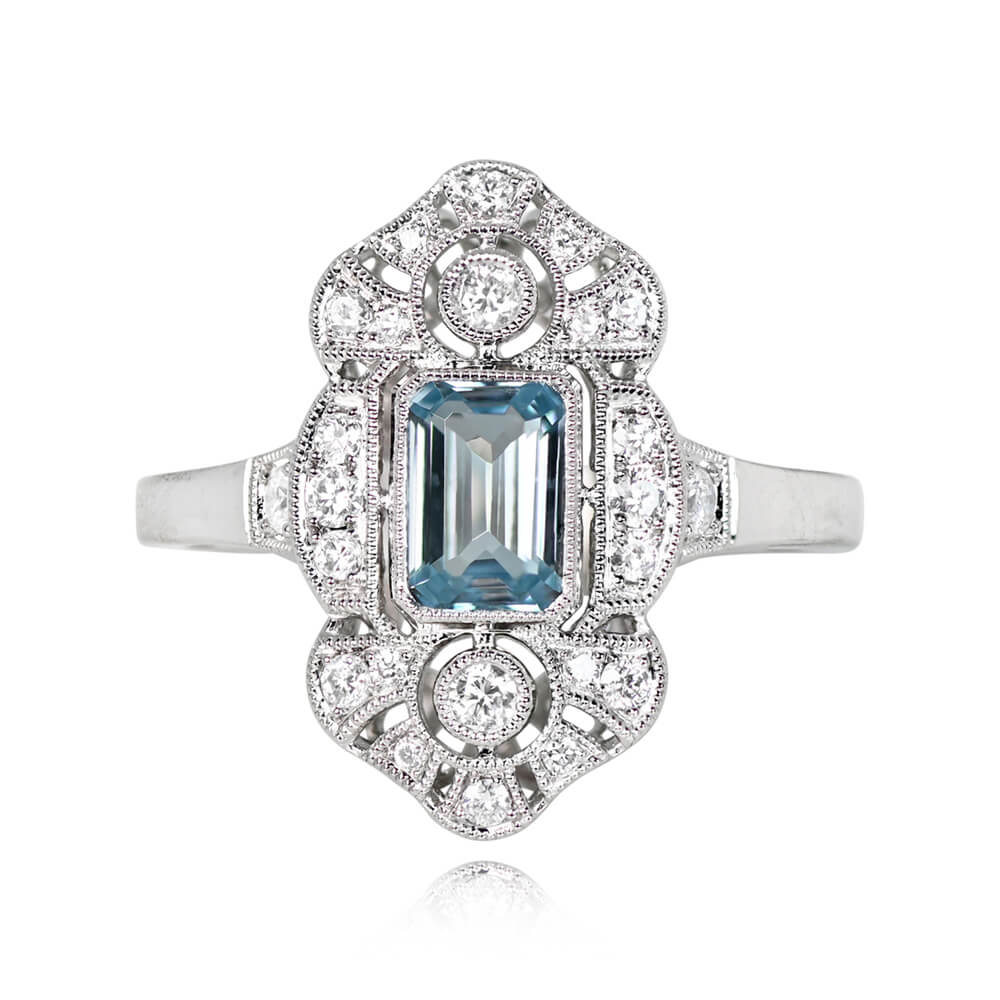 This aquamarine ring centers a bezel-set emerald-cut aquamarine weighing 0.55 carats. The center stone is surrounded by round brilliant cut diamonds set along the elongated mounting, with a single diamond set on each shoulder. The total weight of the diamonds is approximately 0.38 carats. The mounting is platinum, decorated with openwork and fine milgrain.