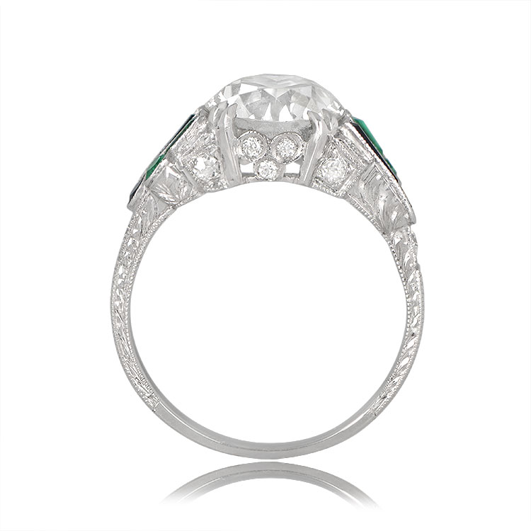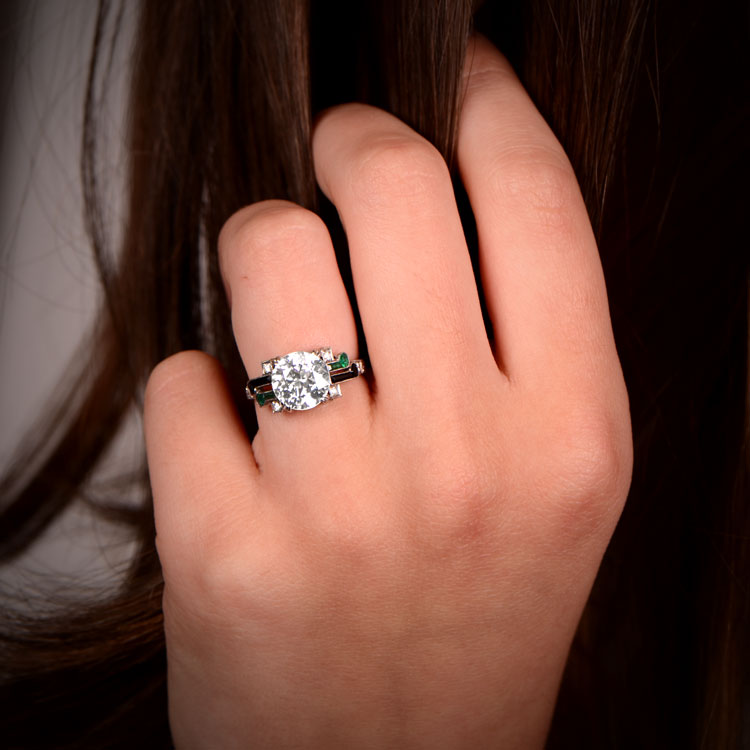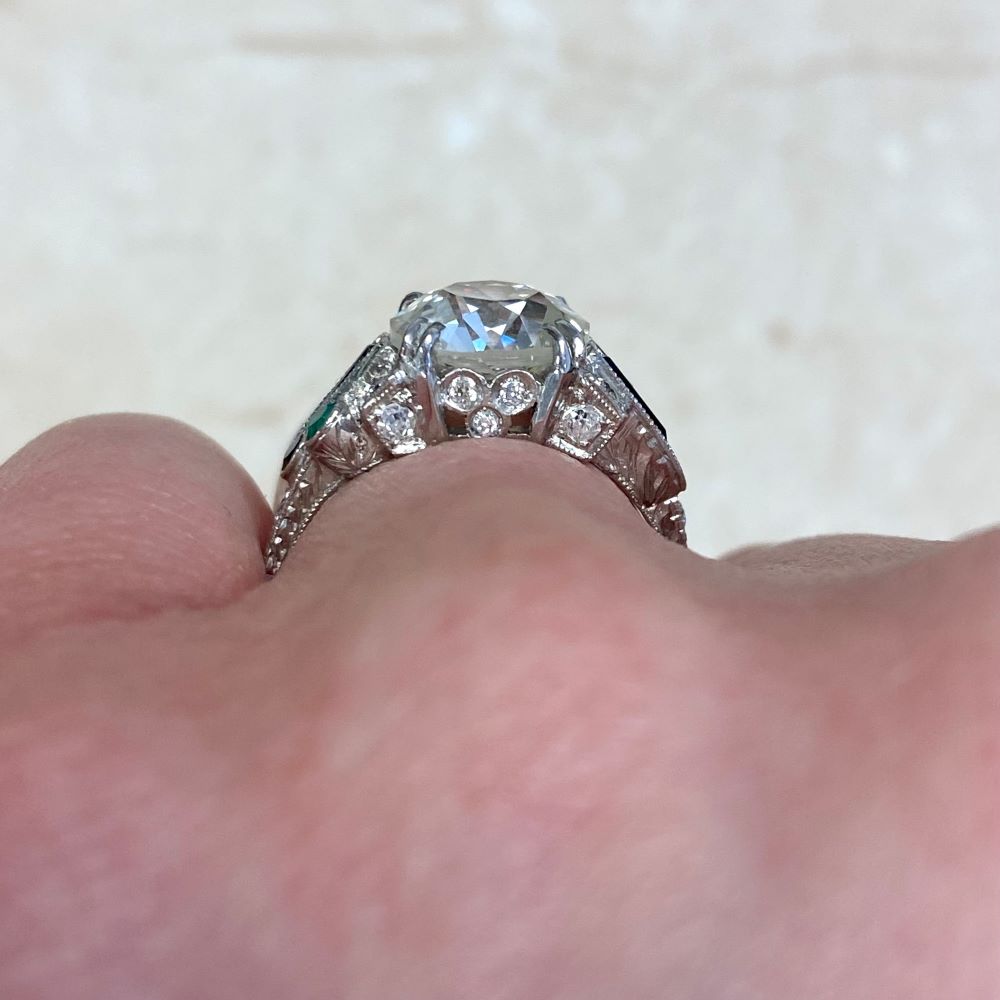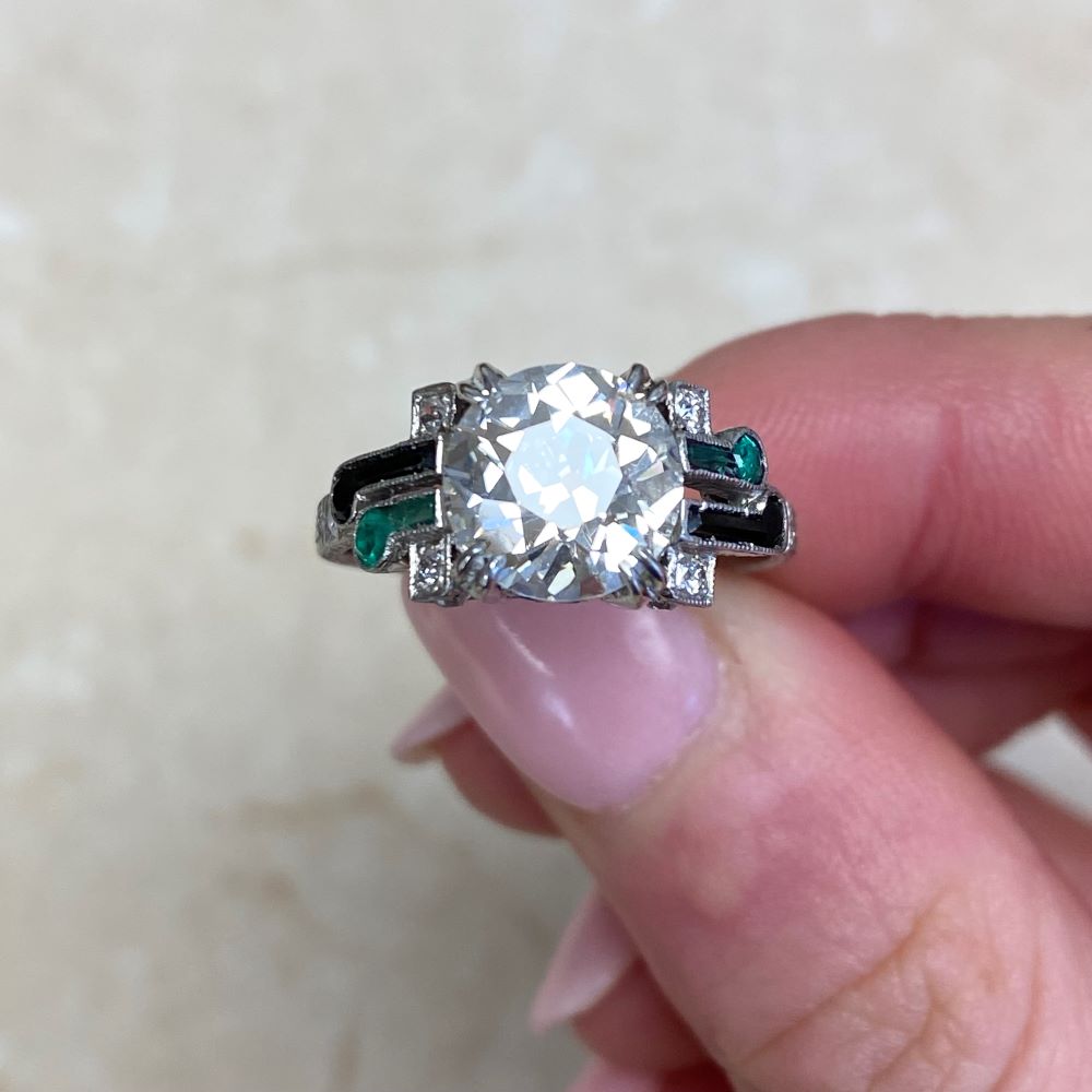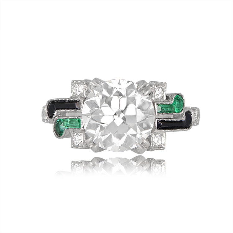 A very impressive Art Deco-inspired Engagement Ring adorned by onyx and emerald accents on the shoulders. Diamonds on the corners further grace the center old European cut diamond. This ring was handcrafted by our jewelers in platinum and is decked with diamonds along with the gallery and shoulders.