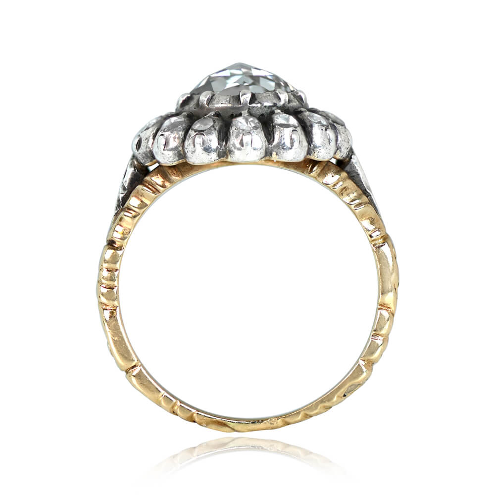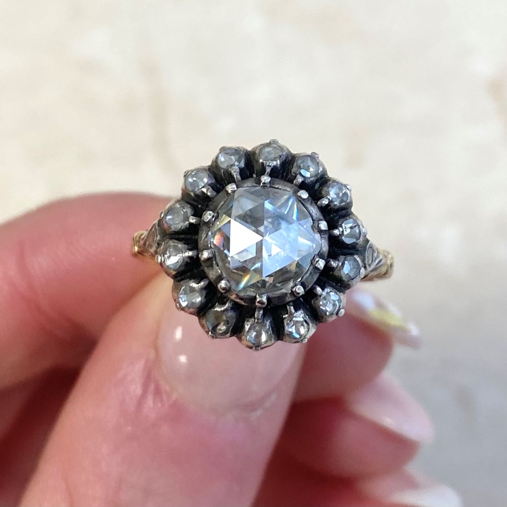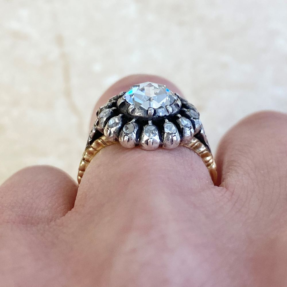 A Georgian era ring featuring a bezel-set rose cut diamond with a weight of approximately 1.00 carat, J color and VS2 clarity. The center diamond is surrounded by a floral motif set with rose cut diamonds, with a single rose cut set on each shoulder. This ring is silver on 18k yellow gold, and the center diamond is backed. Hand-engravings decorate the backing, shoulders, and shank. This ring is antique and was handcrafted circa 1800.