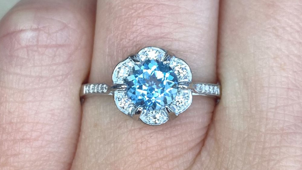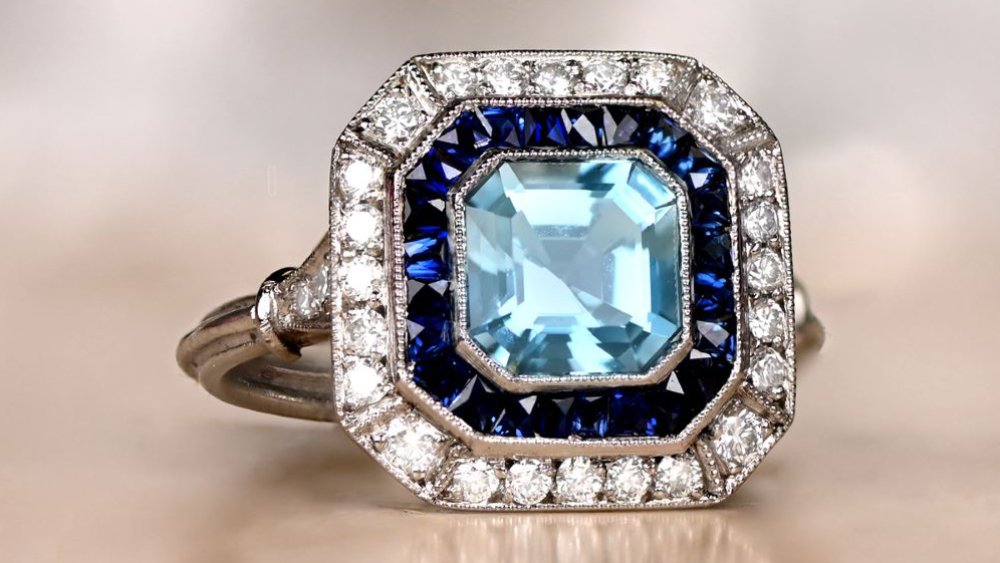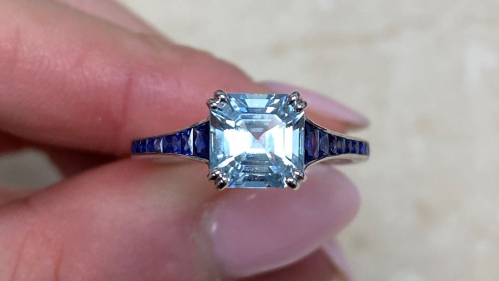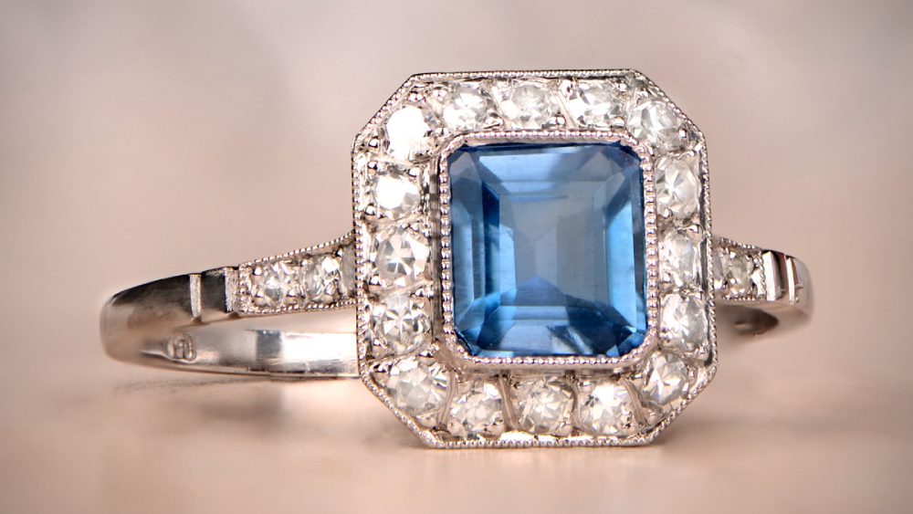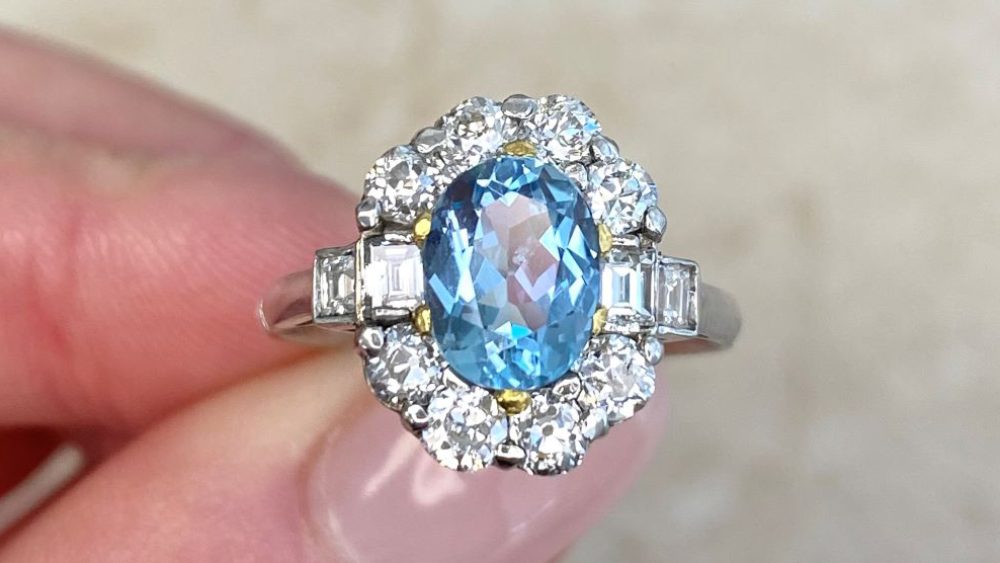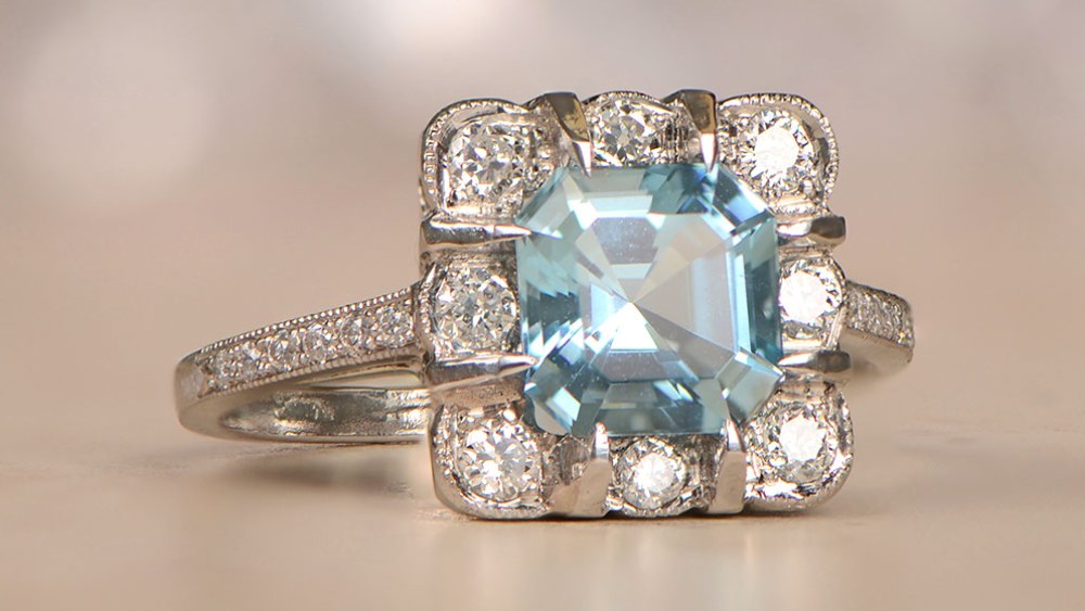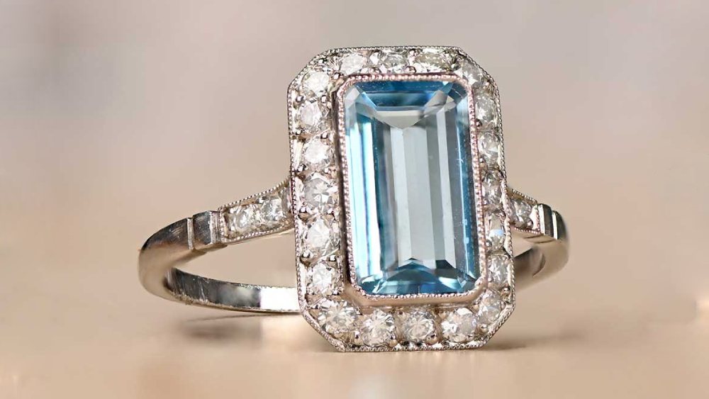 Firstly, let’s begin with the center stone: It’s a 0.78-carat rectangular-shaped aquamarine with a lively color. Secondly, a halo of old mine-cut diamonds and openwork creates complex patterns that are bound to catch everyone’s eye. The diamonds stretch over to the tapered shoulders and total approximately 0.20 carats.