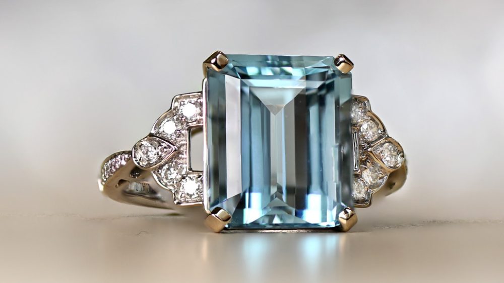 This breathtaking dome-style piece of jewelry was handcrafted circa 1950 and holds a 1.64-carat aquamarine set in eight prongs. Even though the gemstone’s beauty is undeniable, all eyes are on the impressive shoulders. They are decorated with diamonds and subtle milgrain. Ladies that love bold jewelry will fall in love with this ring as soon as they see it.