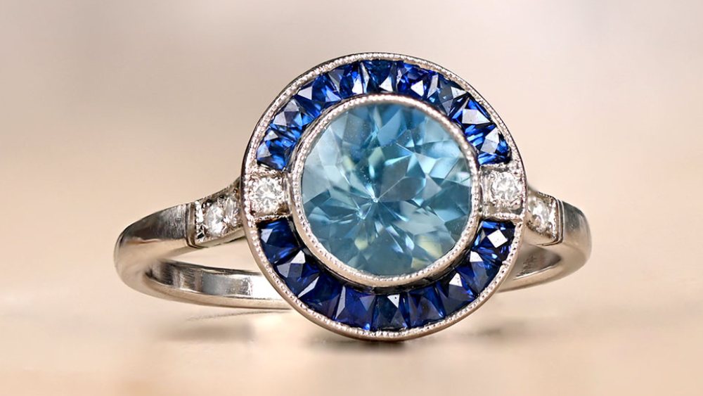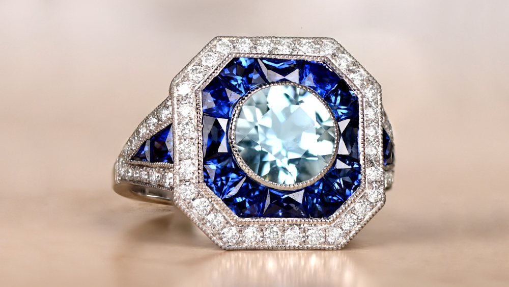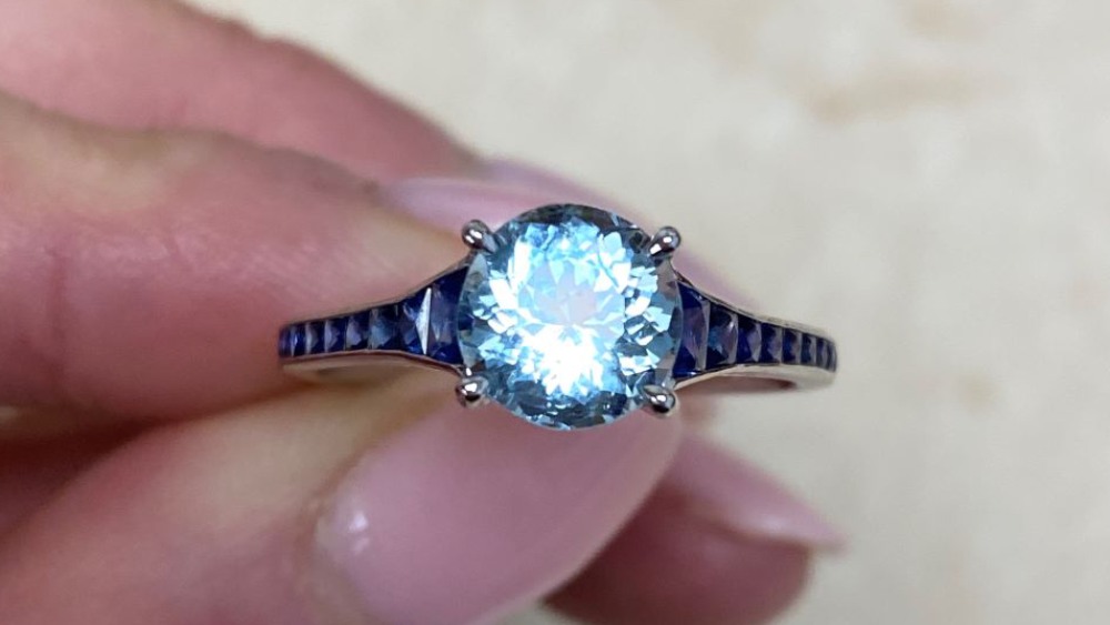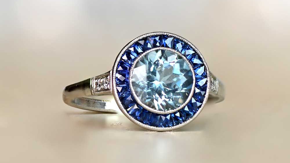 This platinum ring is certainly striking. The main stone is a round-cut aquamarine set in prongs and weighing approximately 1.24 carats, however, that is immensely enhanced by the bold sapphires. The natural French-cut sapphires channel set along the tapered shoulders and down the shank are a darker blue, thus providing an alluring contrast. Additionally, the gallery displays several more sapphires.