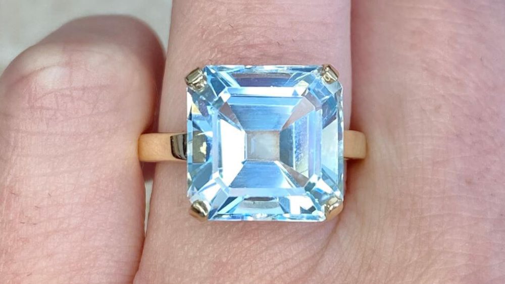 If you’re set on aquamarine, but still want a classic look, then why not a solitaire? This minimalistic ring features a 9.28-carat aquamarine gemstone with an asscher cut and set in prongs. Granting fantastic contrast, this vintage ring has been handcrafted in 14k yellow gold and is certainly more breathtaking for it.