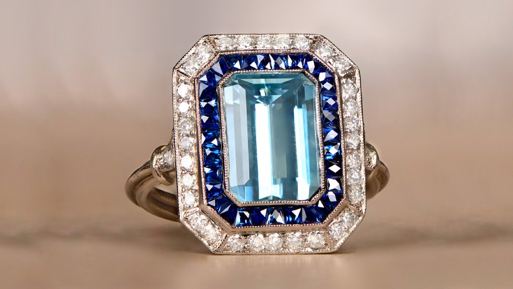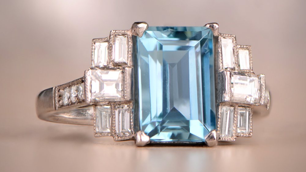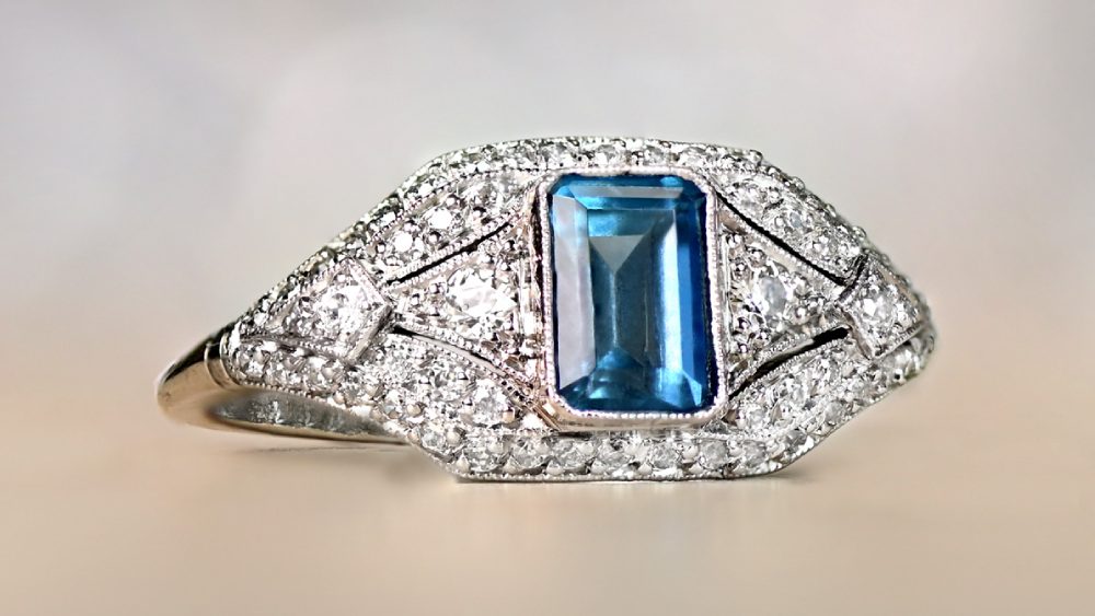 The center stone is a 0.89-carat emerald-cut aquamarine. The wide shoulders certainly make this ring stand out. Unique patterns of old European-cut diamonds cover the top face all around the center stone from shoulder to shoulder and emphasize the center stone’s rectangular shape. The finishing touch is the under-gallery decorated with subtle openwork.