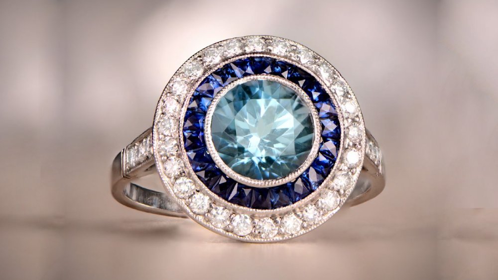 This classy and stylish ring features a 1.00-carat aquamarine stone surrounded by a halo of French-cut sapphires weighing approximately 0.54 carats. Adorning the shoulders are diamonds, which continue up to the sapphire halo. As far as halo rings go, this one is certainly quite elegant in that it features several elements but doesn’t compromise it’s beauty by overdoing it.