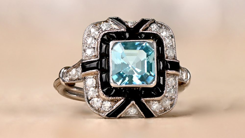 Aquamarine can be combined with numerous stones, and this ring proves it. The center stone is a 1.08-carat asscher-cut aquamarine with impressive saturation. An onyx halo wraps around the gemstone and is surrounded by a diamond halo. Old European-cut diamonds decorate the shoulders, which lead to a triple-wire shank. The total diamond weight is approximately 0.33 carats