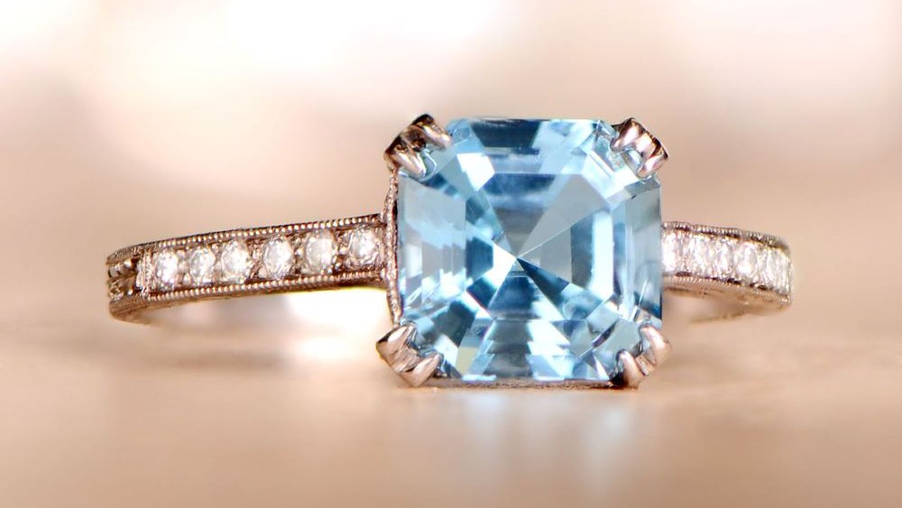If you want a classic ring with exquisite details, then this is it. The center stone is a 1.54-carat aquamarine with a lovely shade, set in four prongs. Diamonds adorn the shoulders and down the shank, creating contrast and highlighting the gemstone’s saturation. If your lady loves elegance and simplicity but still enjoys a few extra details, she’ll be dazzled by this ring.