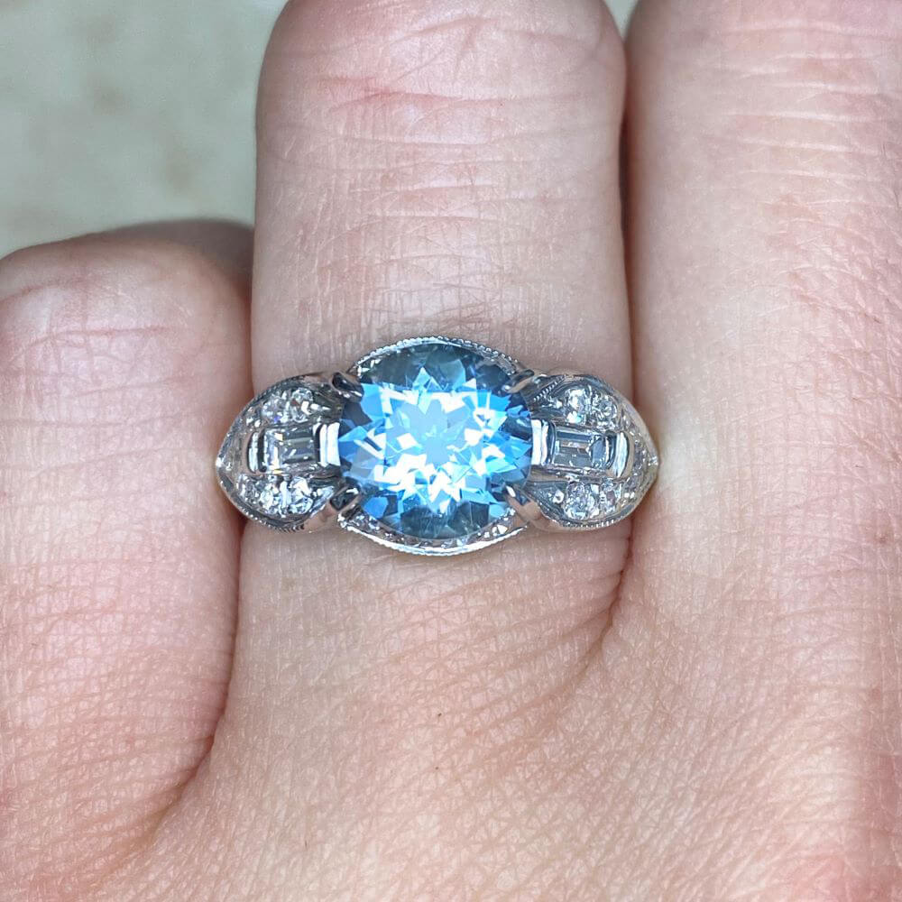 The center stone is an impressive aquamarine weighing approximately 2.00 carats, but the side stones make it much more special. Four vertically placed baguette-cut diamonds and a horizontally placed one in between is the alluring arrangement found on each side. What’s more, the shoulders are decorated with additional small diamonds.