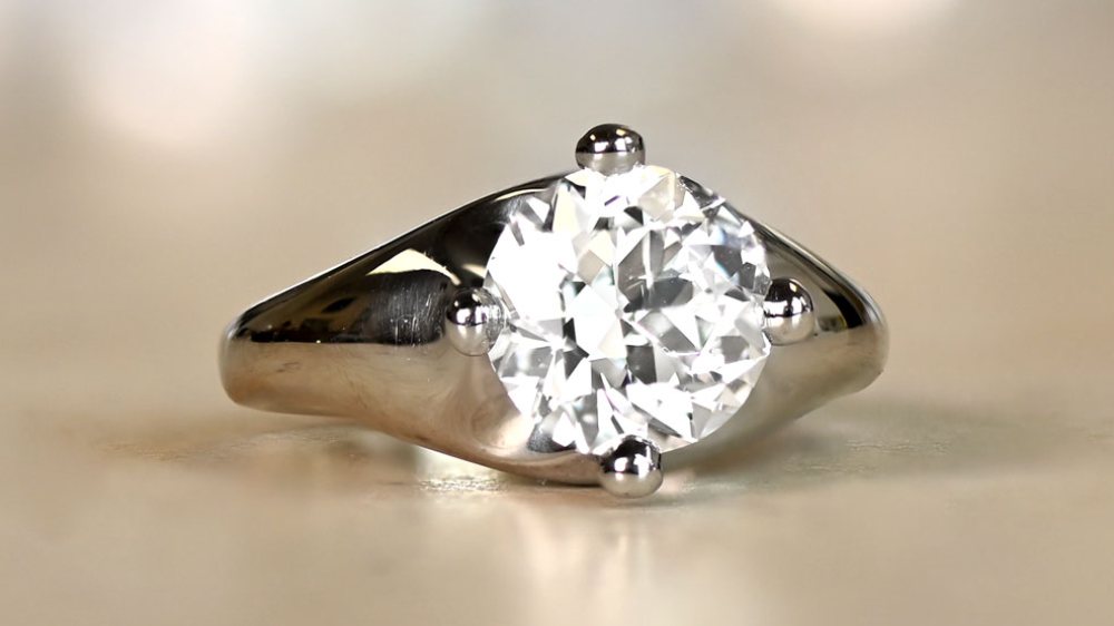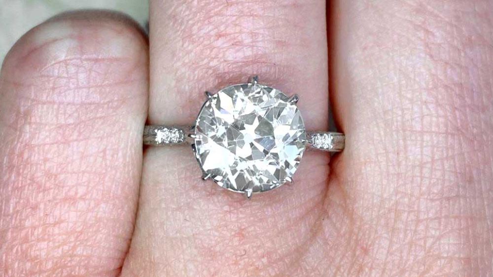 The Whitby ring is a delicate antique ring, perfect for those seeking a classic look. Handcrafted circa 1920, this ring features a 3.29-carat old European-cut center diamond set in prongs. Elevating the ring’s beauty are additional embellishments in the form of hand engravings all along and around the shank, as well as several small diamonds adorning the shoulders.