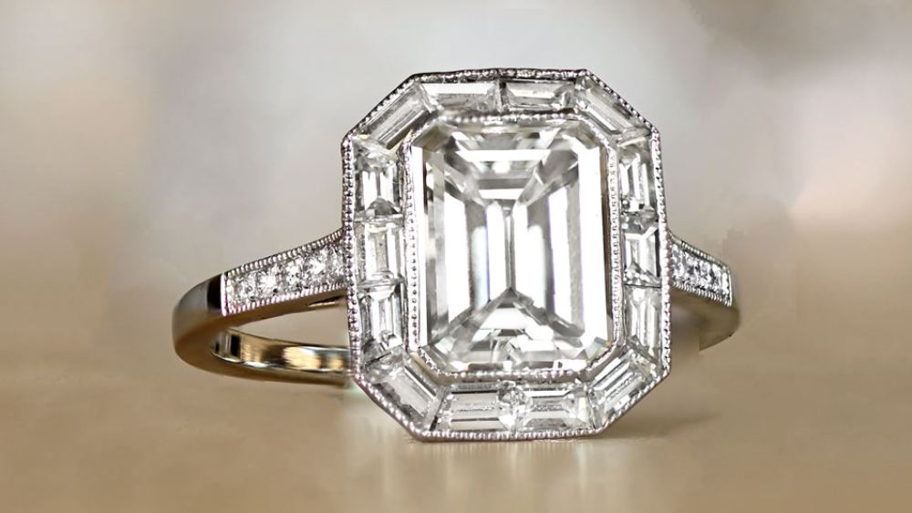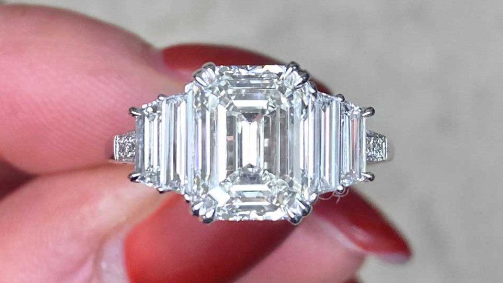 Firstly, the 2.5-carat center diamond is GIA certified and is rated VS1 for clarity, and is emerald-cut. Two baguette diamonds flank either side of the center diamond, leading to three smaller diamonds on the shoulders. Finally, adorning the gallery on either side is a row of 8 round brilliant diamonds.