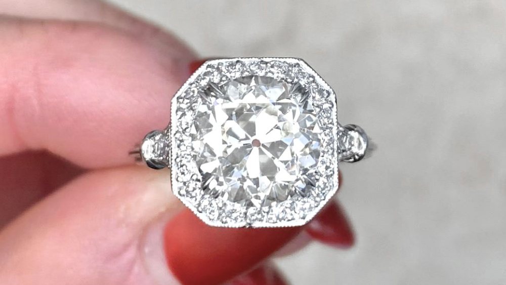 Although the center 3.02-carat diamond has an old European cut, the ring features an octagonal shape due to the stone setting adorned with smaller diamonds and milgrain. The shoulders feature additional stones, while the band is made in a classic triple-wire shank style. Last but not least, fine openwork decorates the under-gallery.