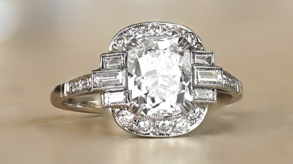 The stunning Doylestown ring features a 2.02-carat, elongated cushion-cut center diamond which is colorless and GIA certified. Surrounding the center stone is a halo of antique round diamonds with three baguette-cut diamonds interrupting it on each side where the shoulders begin. Speaking of the shoulders, they are adorned with further diamonds. Finally, the gallery displays bold openwork.