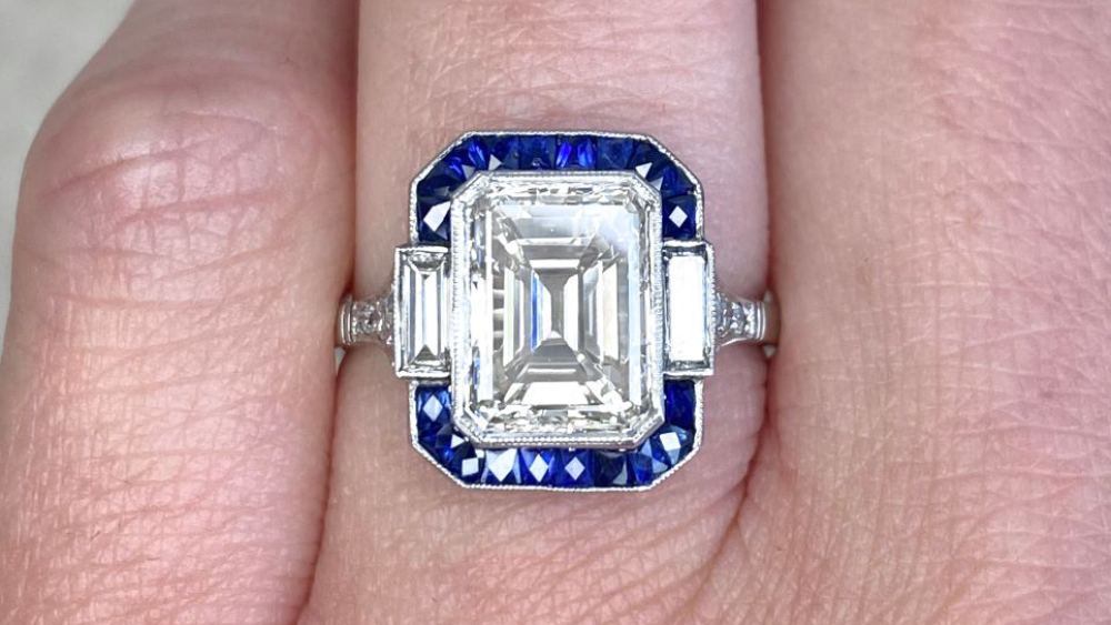 The 3.05-carat diamond in the center of this ring has a fair tint but is of great clarity, which is crucial for an emerald cut. A genuine sapphire halo surrounds the main stone, while two more diamonds adorn the shoulders. Otherwise, the design is quite minimalistic, but the under-gallery features fine openwork, adding a bit of flare. Finally, the ring holds a GIA certificate.