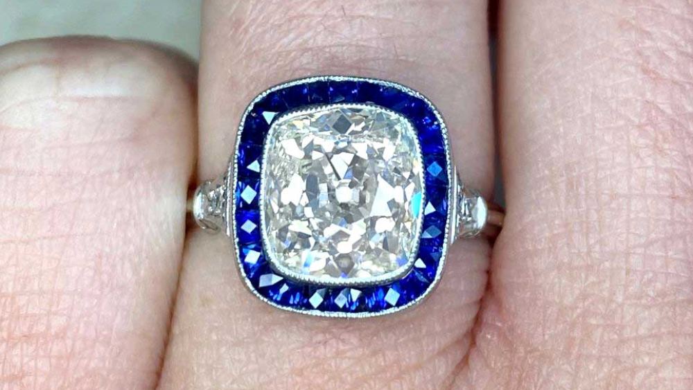 The regal ring features a high profile center diamond which weighs 3.38 carats and is antique cushion cut. Surrounding the stunning center diamond are calibre-cut natural sapphires arranged in a floral pattern and continuing down the shoulders. Subtle openwork on the gallery helps the patterns pop, and the numerous diamonds covering the gallery and shoulders add significantly to the sparkle factor.