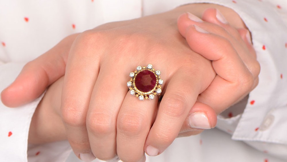 Buccellati is one of the most renowned jewelry houses and this ruby ring is a fine example of their high quality. The precious red stone is a 7.41-carat natural Burma ruby and is set in 18k gold. Surrounding the ruby is a cluster of 10 diamonds. Further embellishing the ring are detailed engravings throughout. This vintage ring is the real deal; it was handcrafted in Italy circa 1970 and carries an M. Buccellati signature.