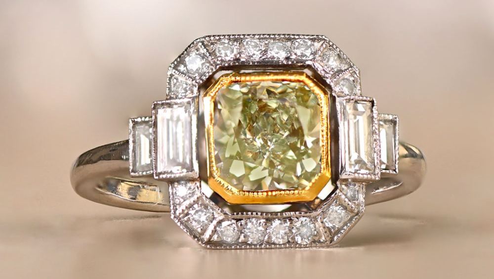Diamonds are a timeless choice, but they don’t have to be clear. Add a pop of color with this 1.15-carat, fancy sunny yellow diamond. Round clear diamonds surround the main stone, while two baguette-cut stones adorn the shoulders of the ring. Furthermore, the Barrow Ring is not only striking but also practical due to its low profile and plain band. The ring holds a GIA certificate.