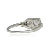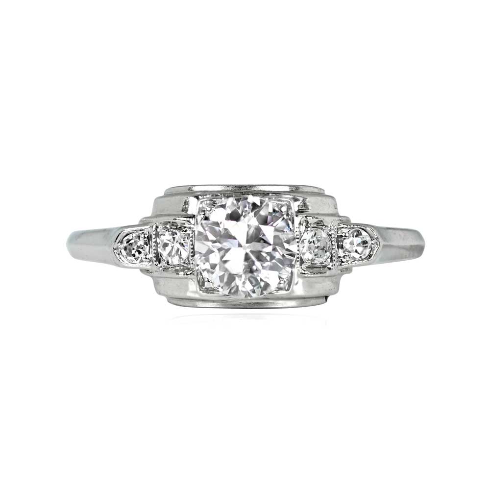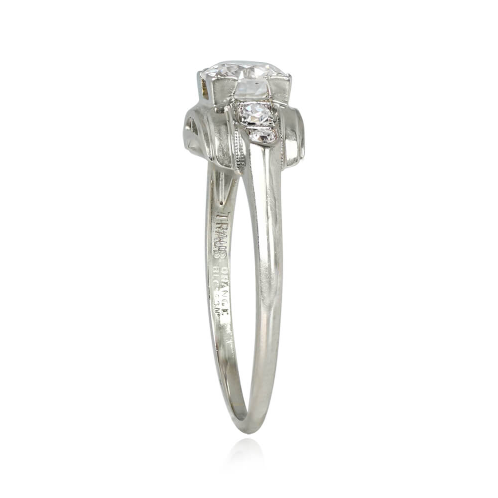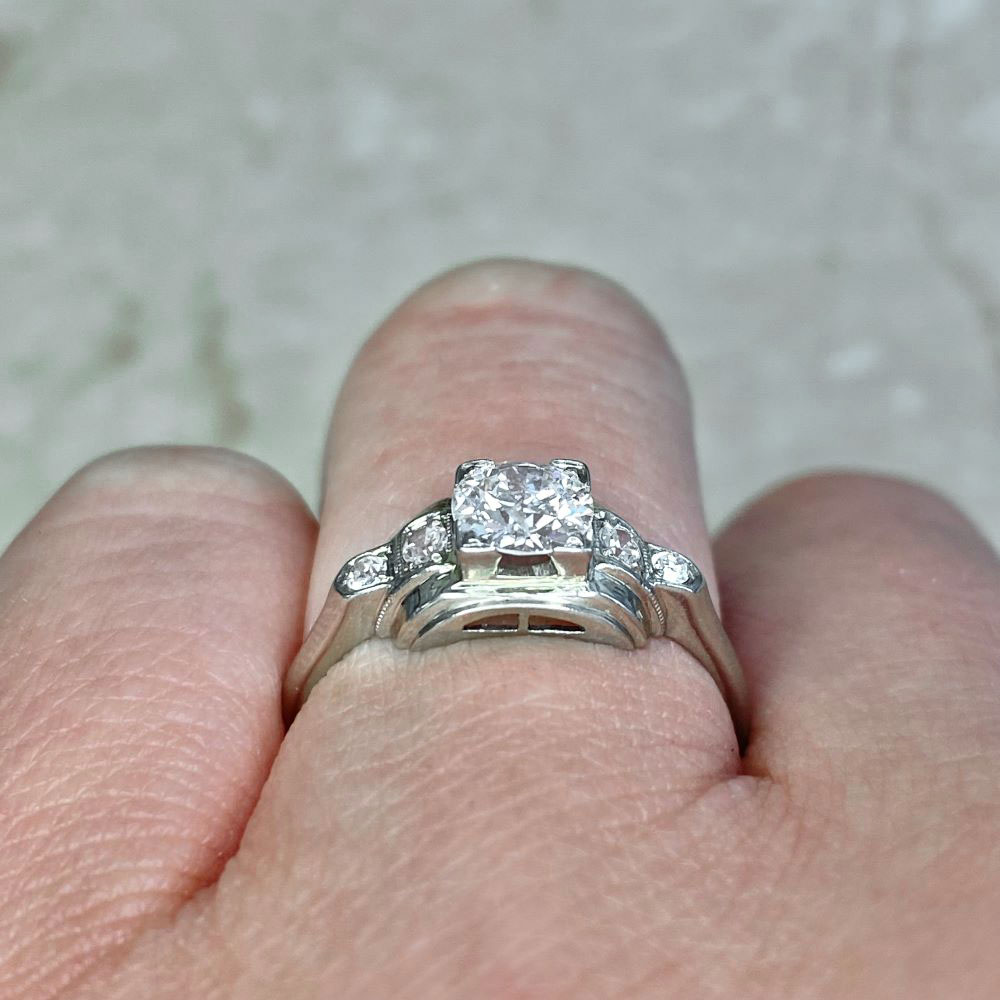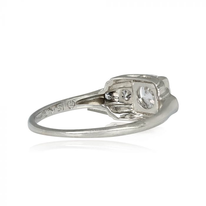 A Retro era engagement ring featuring a 0.50 carat old European cut diamond, I color and SI2 clarity, set in box prongs. The center stone is flanked by single cut diamonds weighing approximately 0.07 carats, set inside geometric bezels. The mounting is curved and handcrafted in 18k white gold. This ring is vintage, circa 1950.